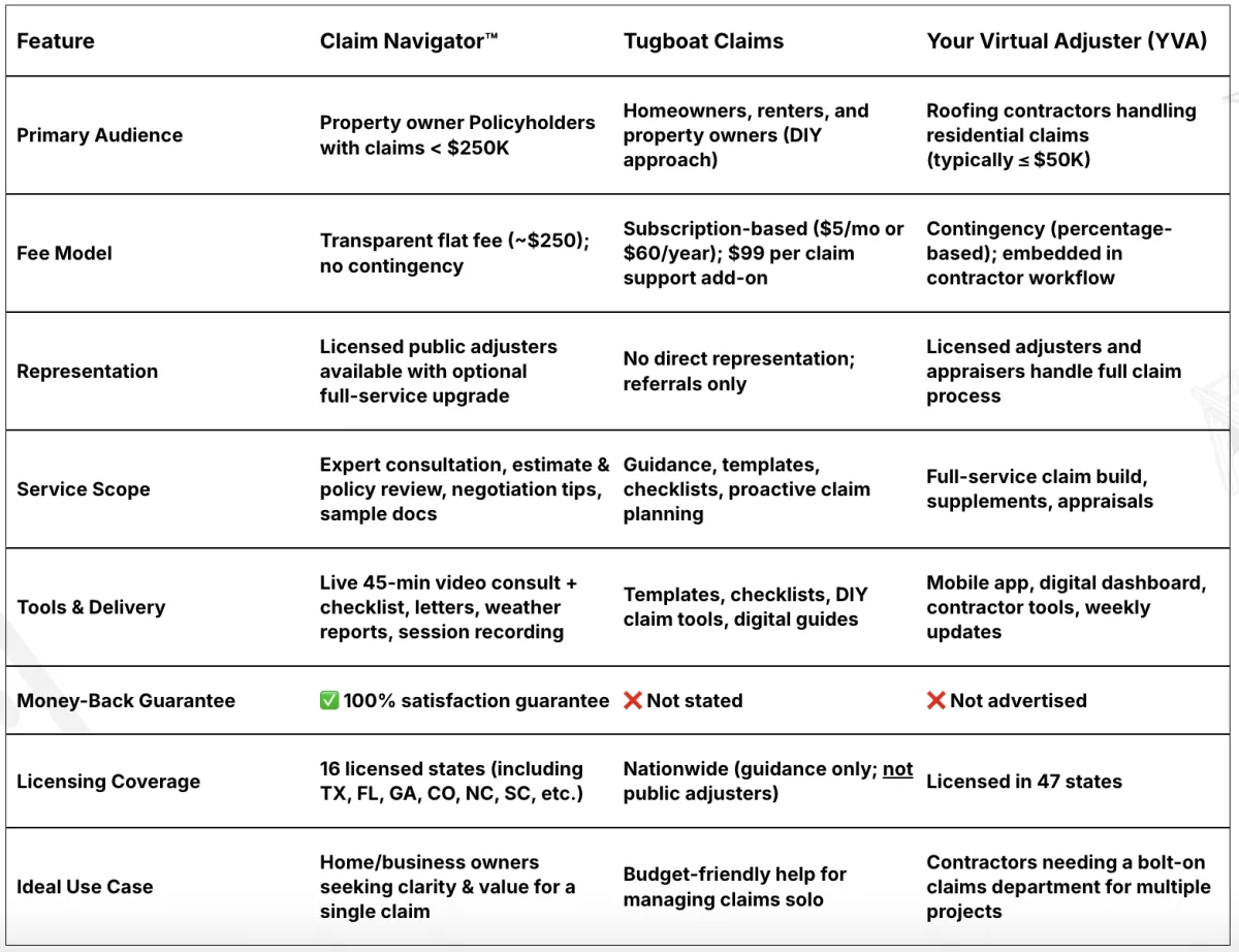 Compare Claim Navigator™ to Tugboat Claims and Your Virtual Adjuster (YVA) to see why more homeowners and small commercial property owners are choosing our flat-fee, no-strings-attached consultation over subscription models and contractor-driven platforms.